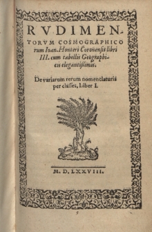 Title: Rvdimentorvm Cosmographicorum Ioan[ni] Honteri Coronensis libri III. cum tabellis Geographicis elegantißimis. De variarum rerum nomenclaturius per classes, Liber I
