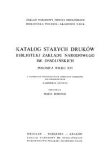 | Katalog starych druków Biblioteki Zakładu Narodowego im. Ossolińskich : polonica wieku XVI | 7 mar 2012 |