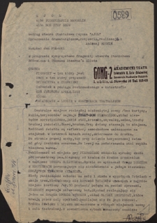 maszynopis ; rękopis ; Scenariusz do przedstawienia teatru GONG2 "Laor, alo posłuchajcie mandolin" wg. utworu Stanisława Czycza. Premiera przedstawienia miała miejsce w dniach 25-29 listopada 1970 roku. ; Załączona korespondencja ze Zrzeszeniem Studentów Polskich w sprawie pozwolenia na wystawienie przedstawienia.