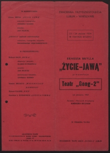 maszynopis ; rękopis ; Scenariusz do przedstawienia teatru GONG2 "Życie jawą" wg Ernesta Brylla. ; Zawiera także: Jerzy Niecikowski - "Moralitet Brylla"; folder promujący przedstawienie w dniach 23 i 24 stycznia 1974 roku w Teatrze Studio.